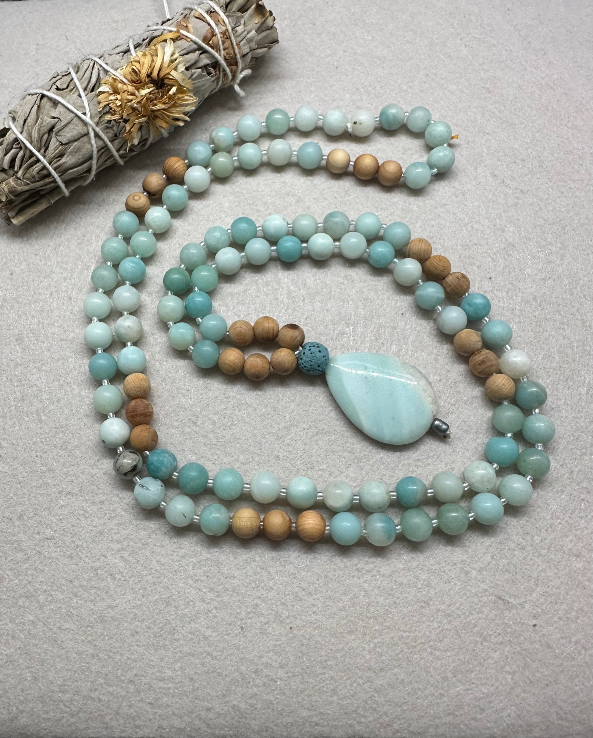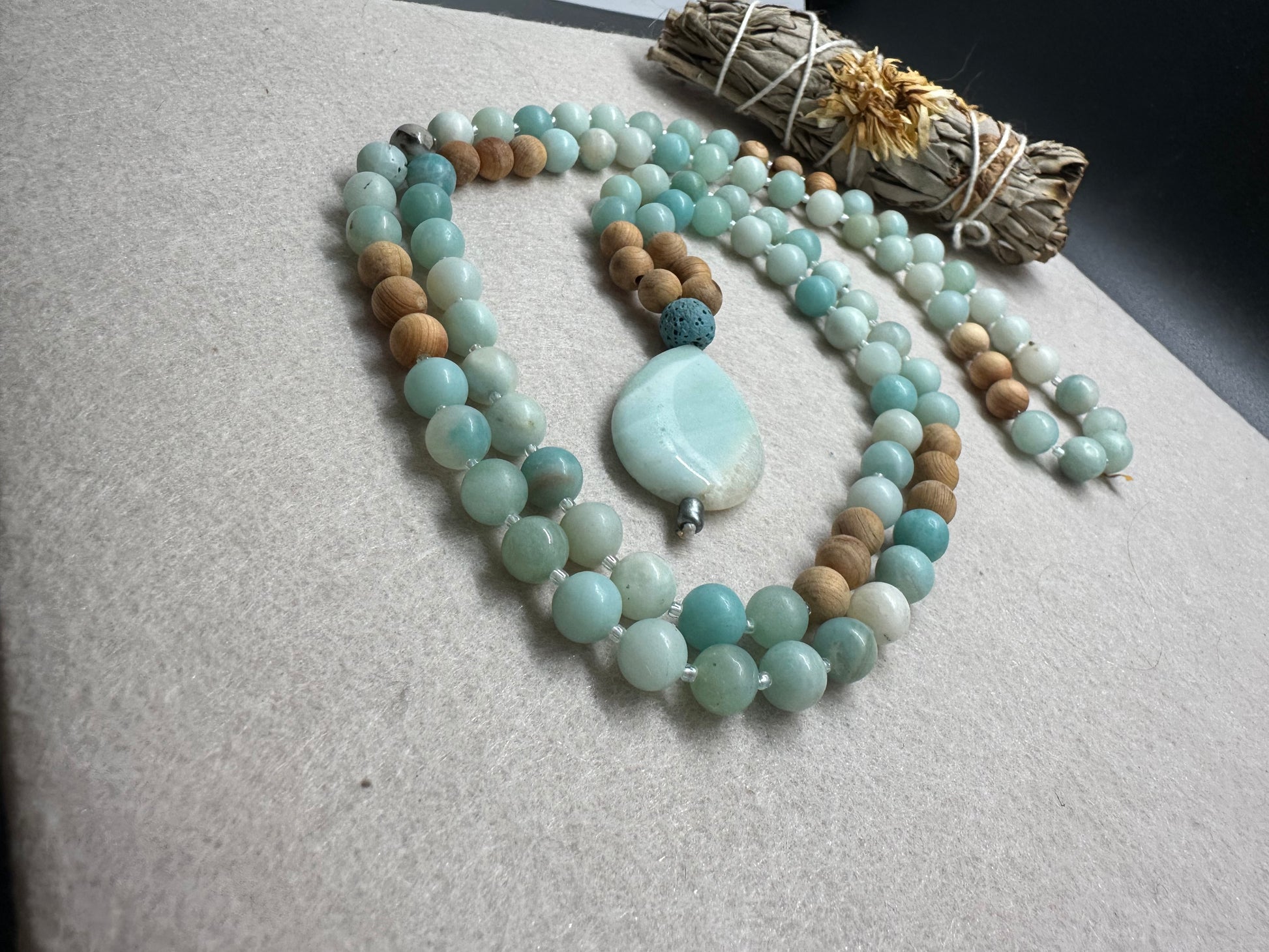 - Amazonite beads in calming aqua, pale green, and soft blue tones — known as the stone of harmony and truth, supporting calm communication and emotional balance.