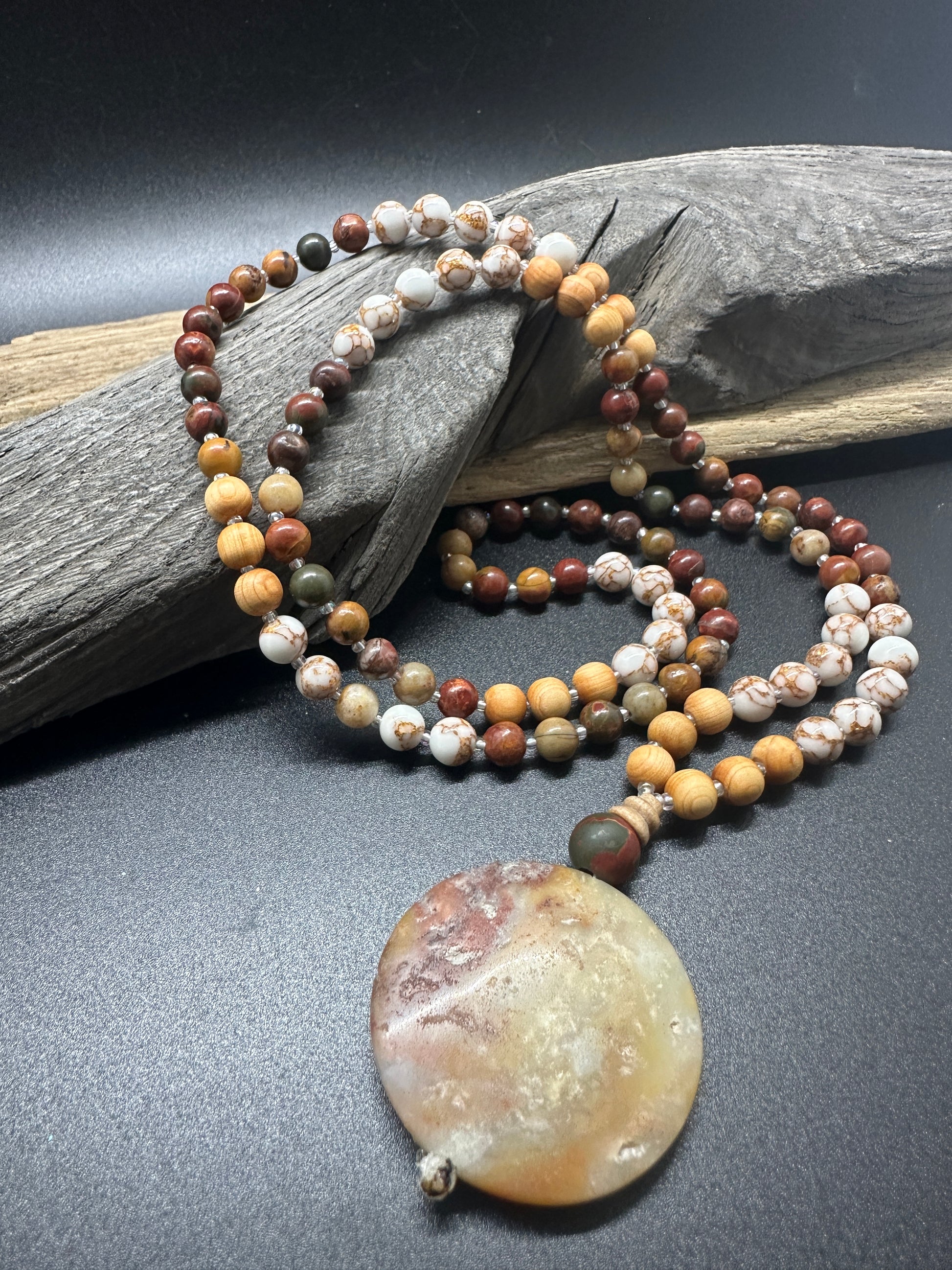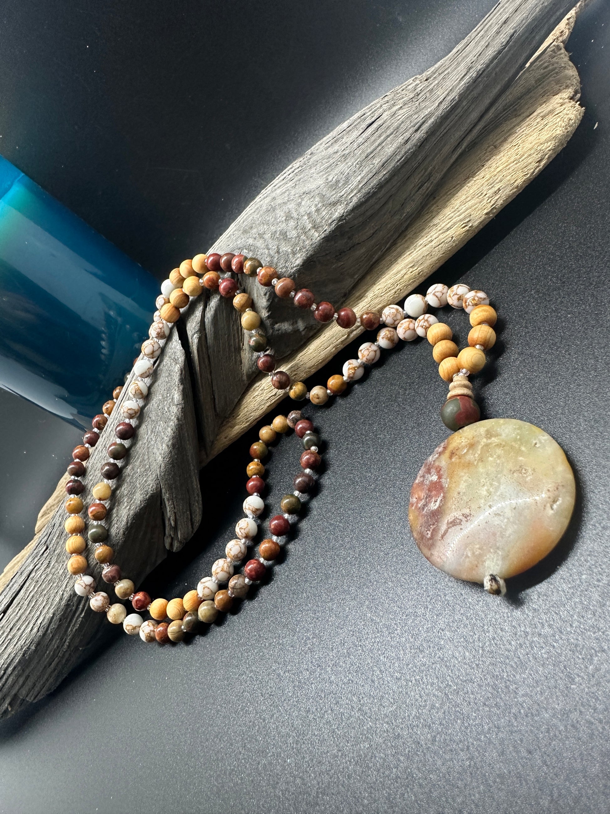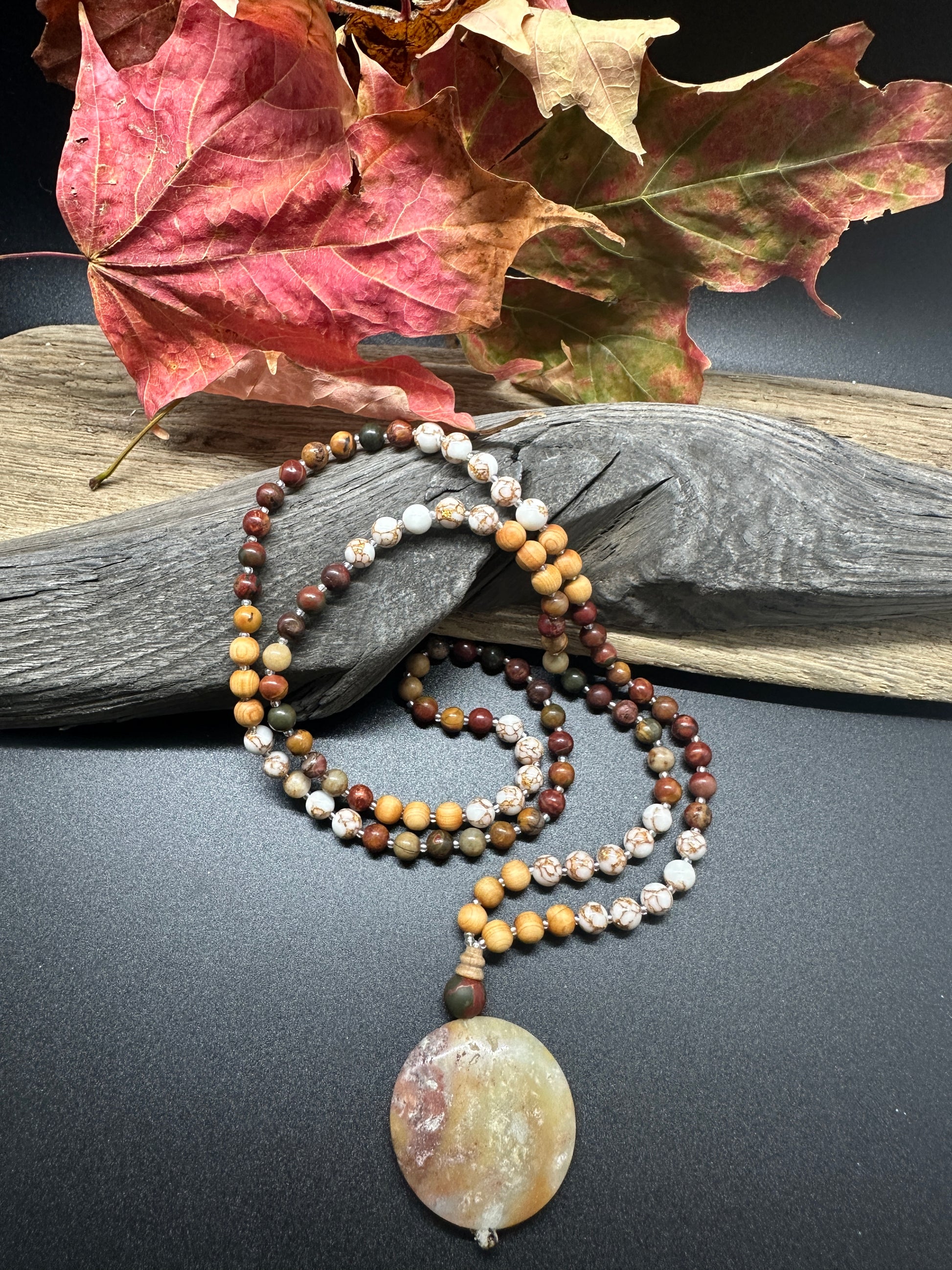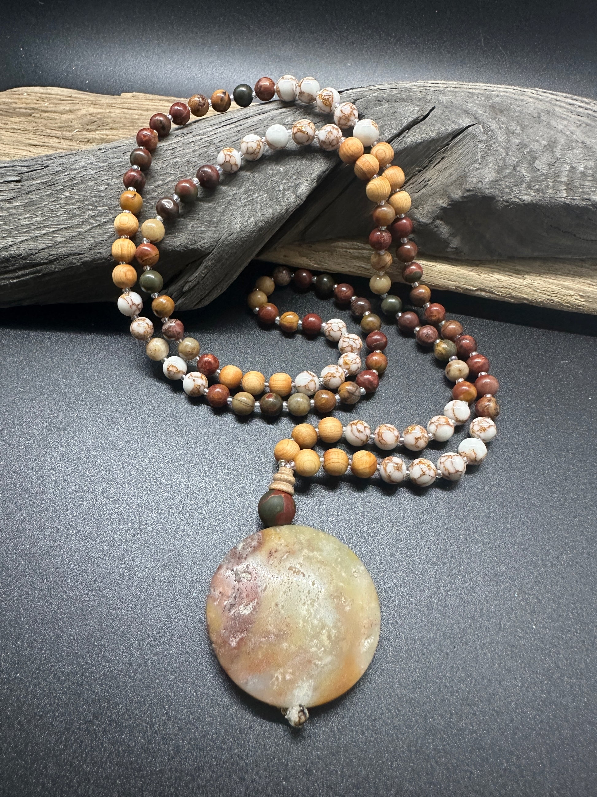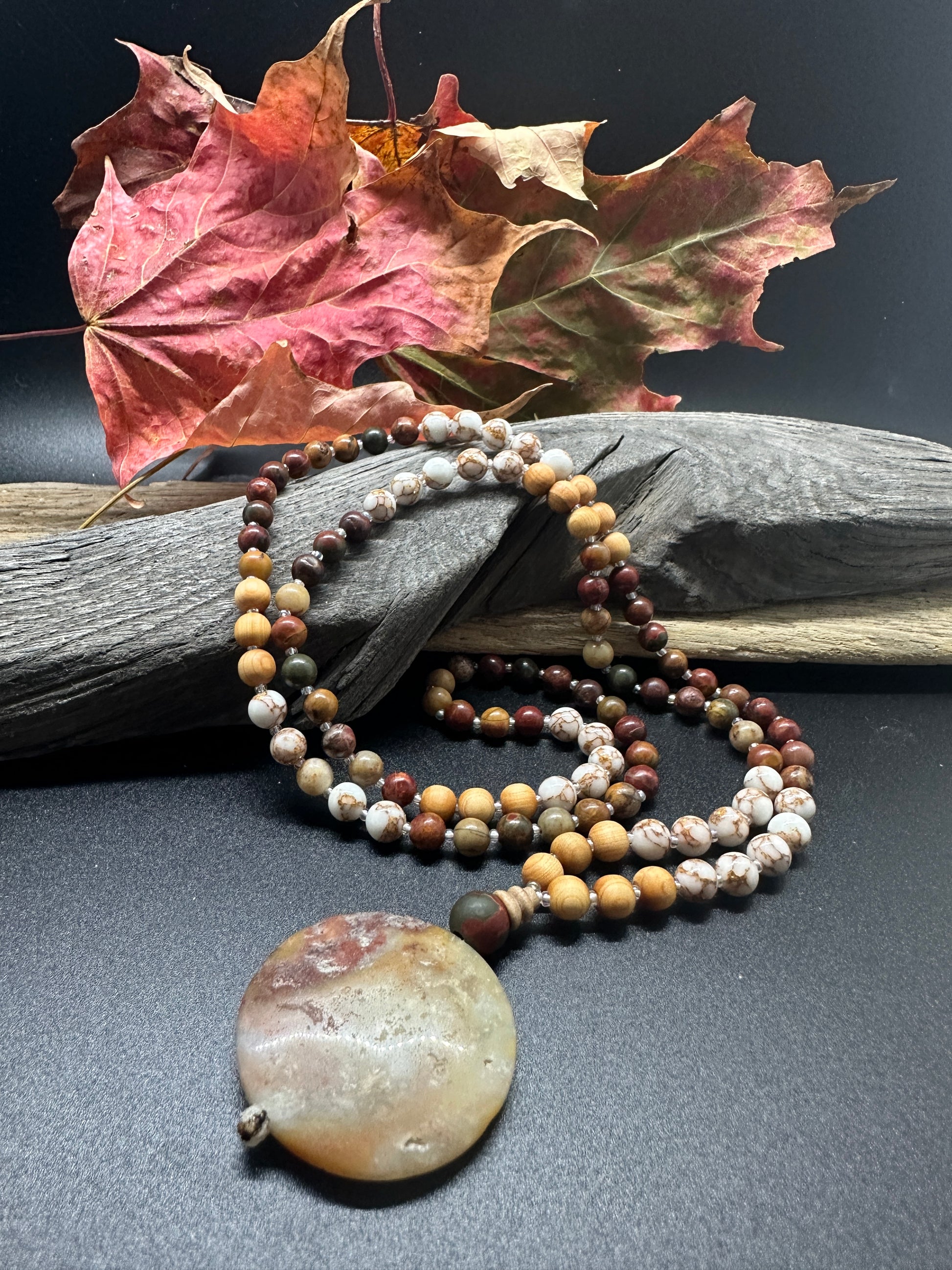 Anchoring the piece is an earth-touched, ancient-feeling guru stone, selected for its grounding, protective, and ancestral resonance. It serves as a reminder that the journey back to center is always available — breath by breath, bead by bead.