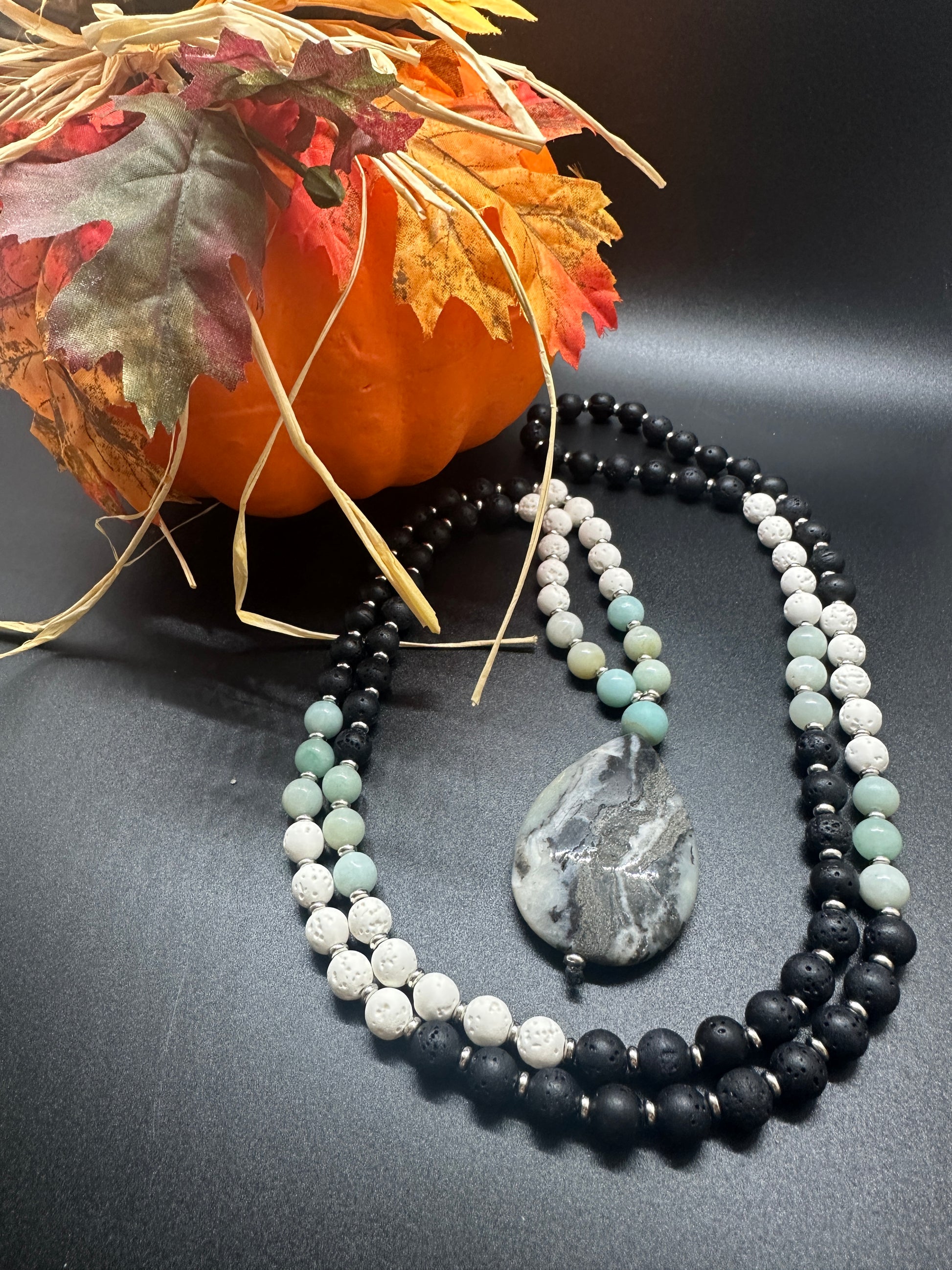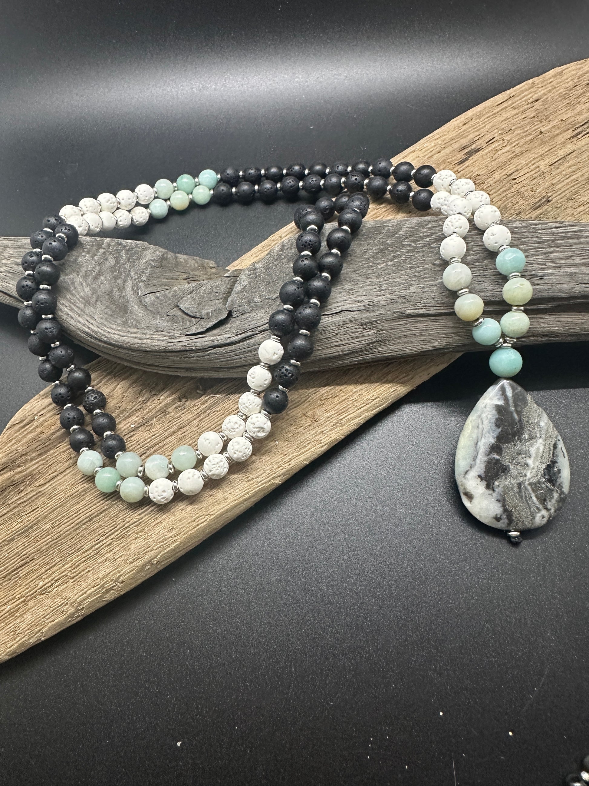 Cool Amazonite beads meet the steady rhythm of black and white lava stones in this calming, balanced mala. The teardrop pendant—softly marbled in shades of storm and stillness—reminds us that peace often lives right beside transformation.