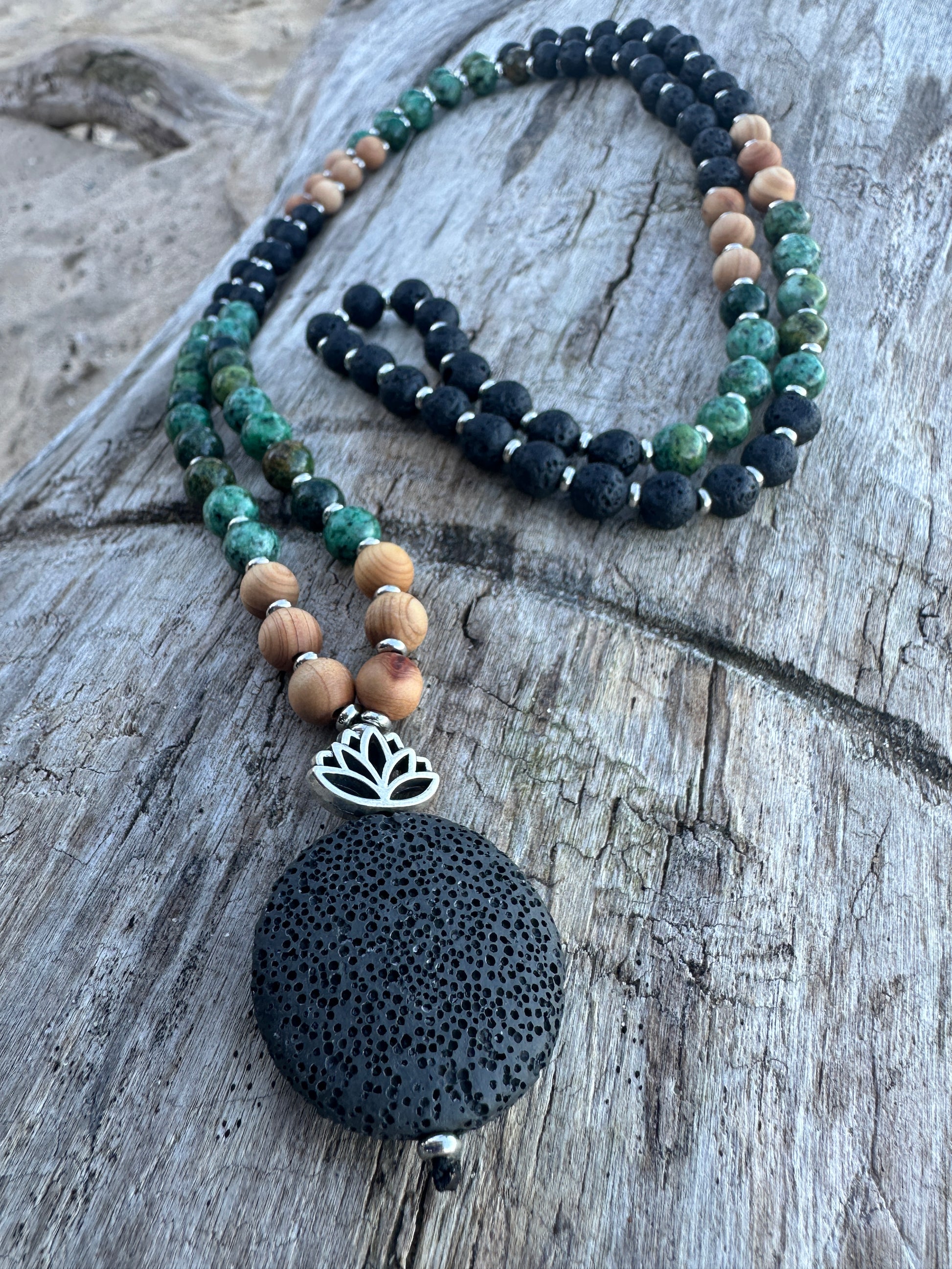 Made with African Turquoise, the “stone of evolution,” she encourages growth and gentle change while reminding you to trust the unfolding of your path. Sandalwood beads infuse calm and sacred stillness, their soft scent a quiet invitation to return to center.