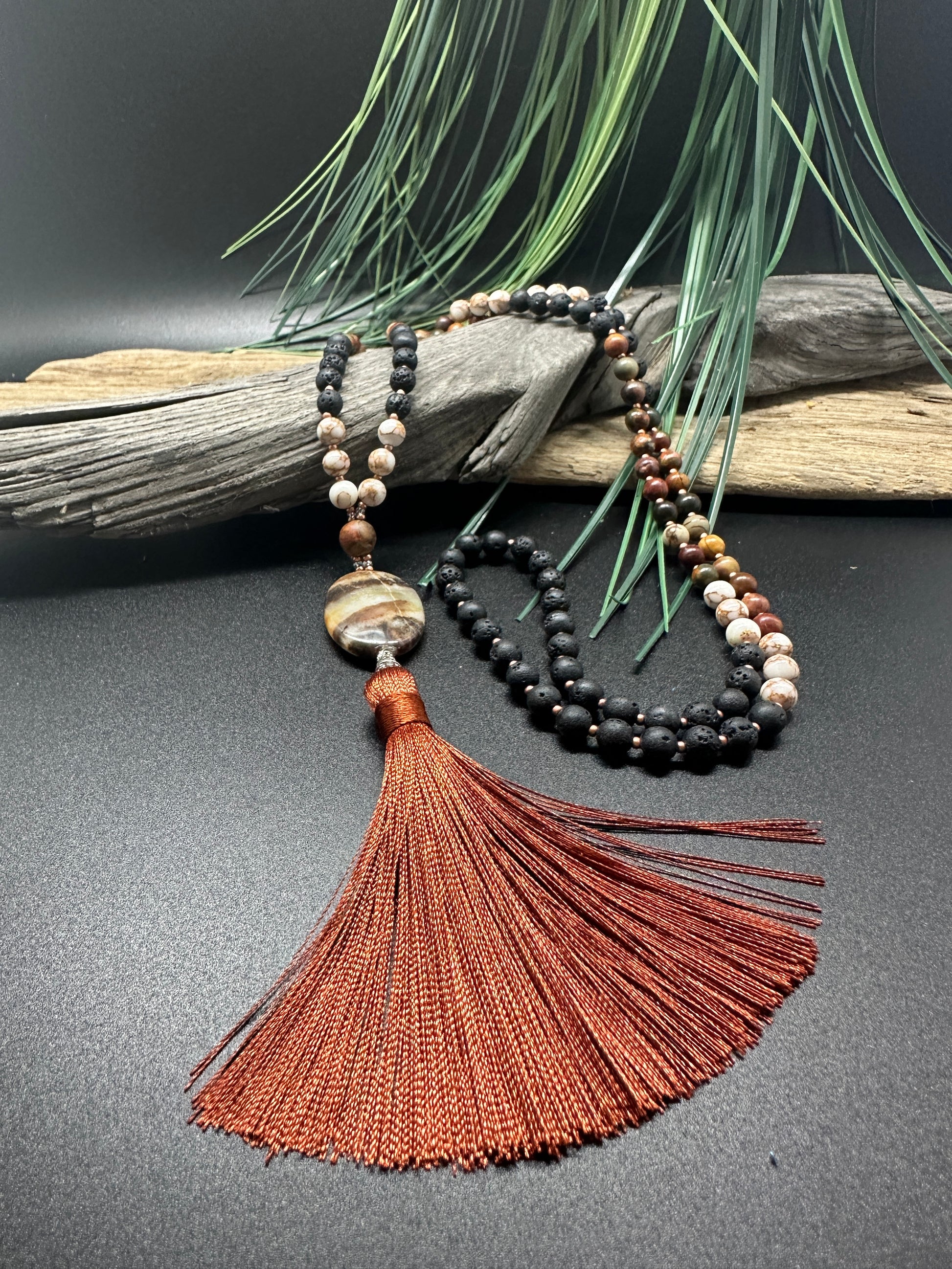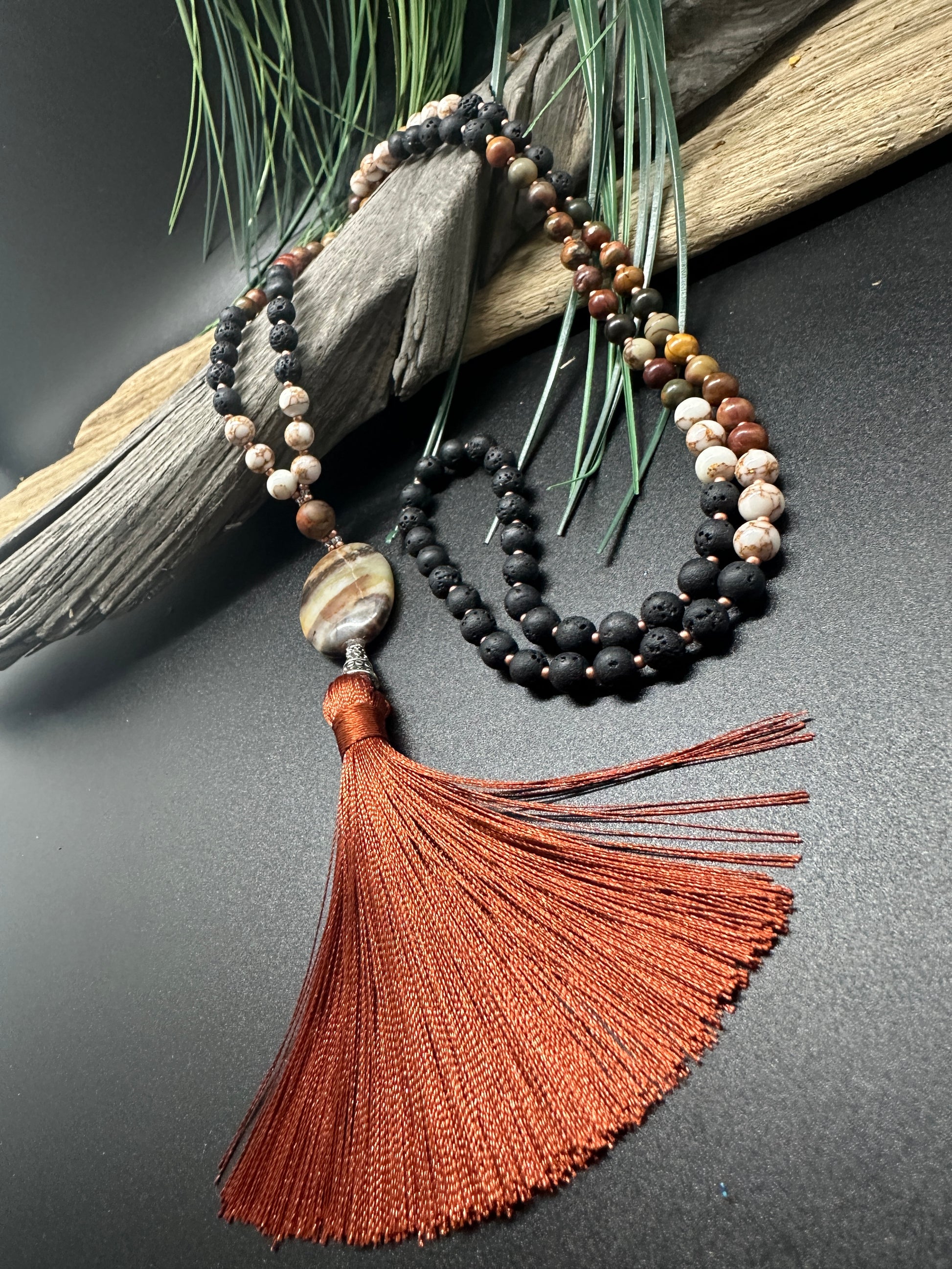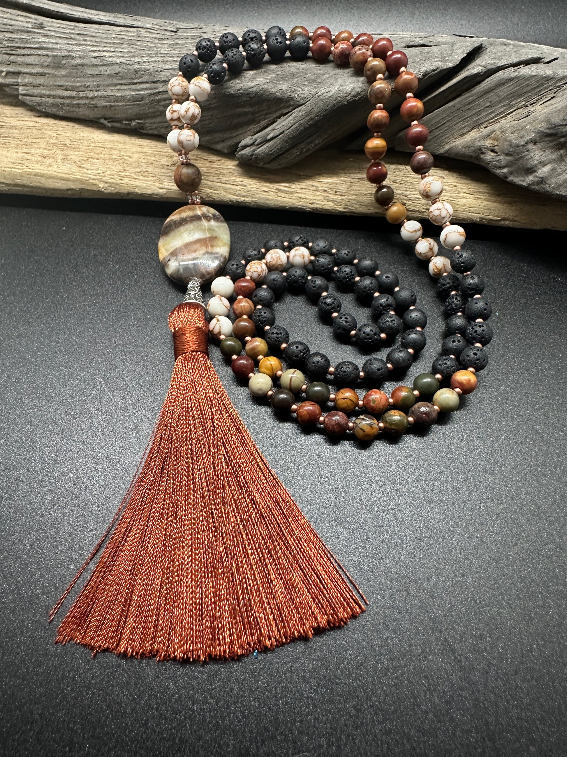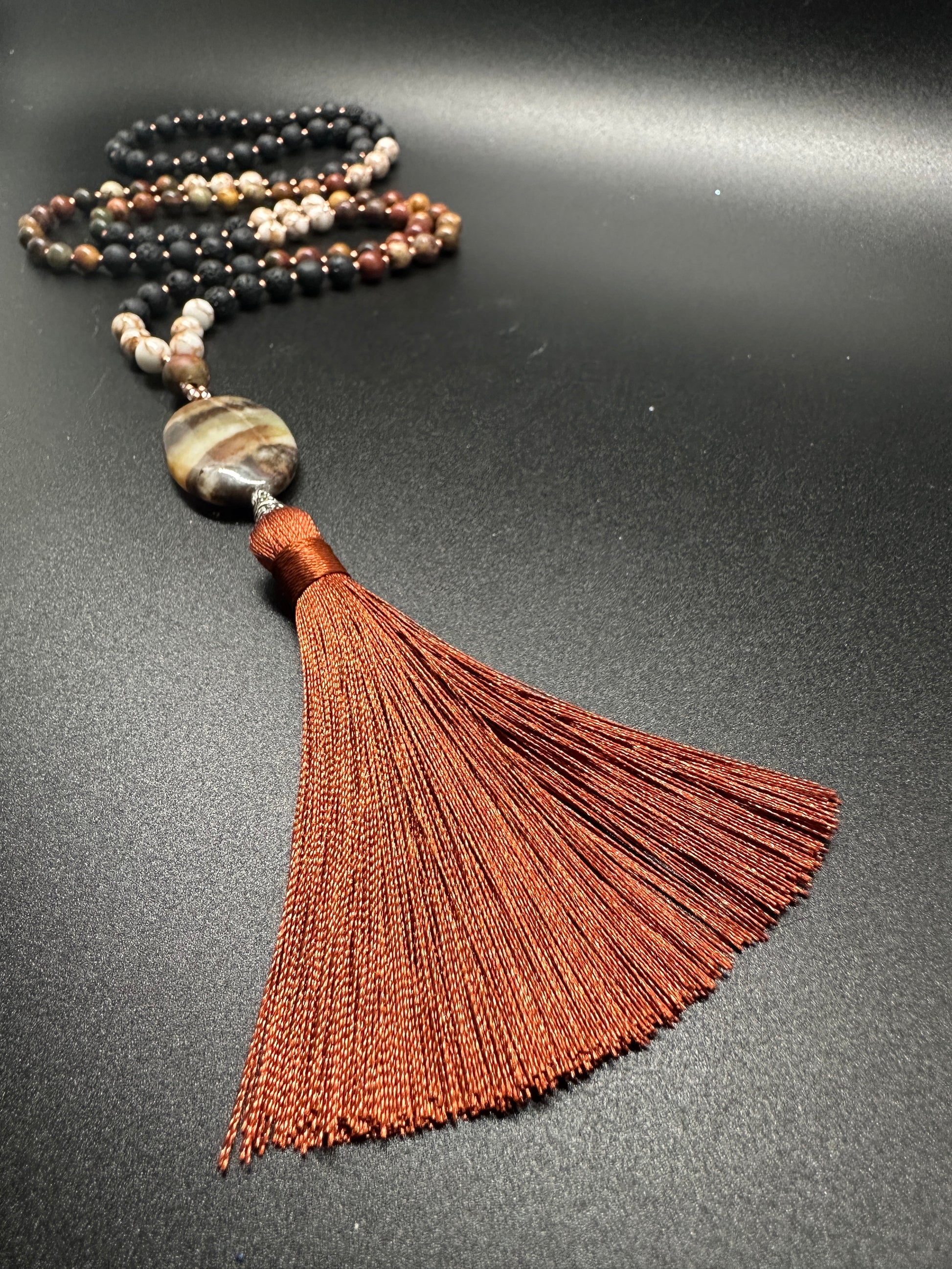 At the heart of the piece rests a banded natural stone, shaped into soft layers that look like a quiet horizon at dawn. Beneath it hangs a warm copper tassel, carrying steady root-chakra grounding and the gentle invitation to settle into your body.