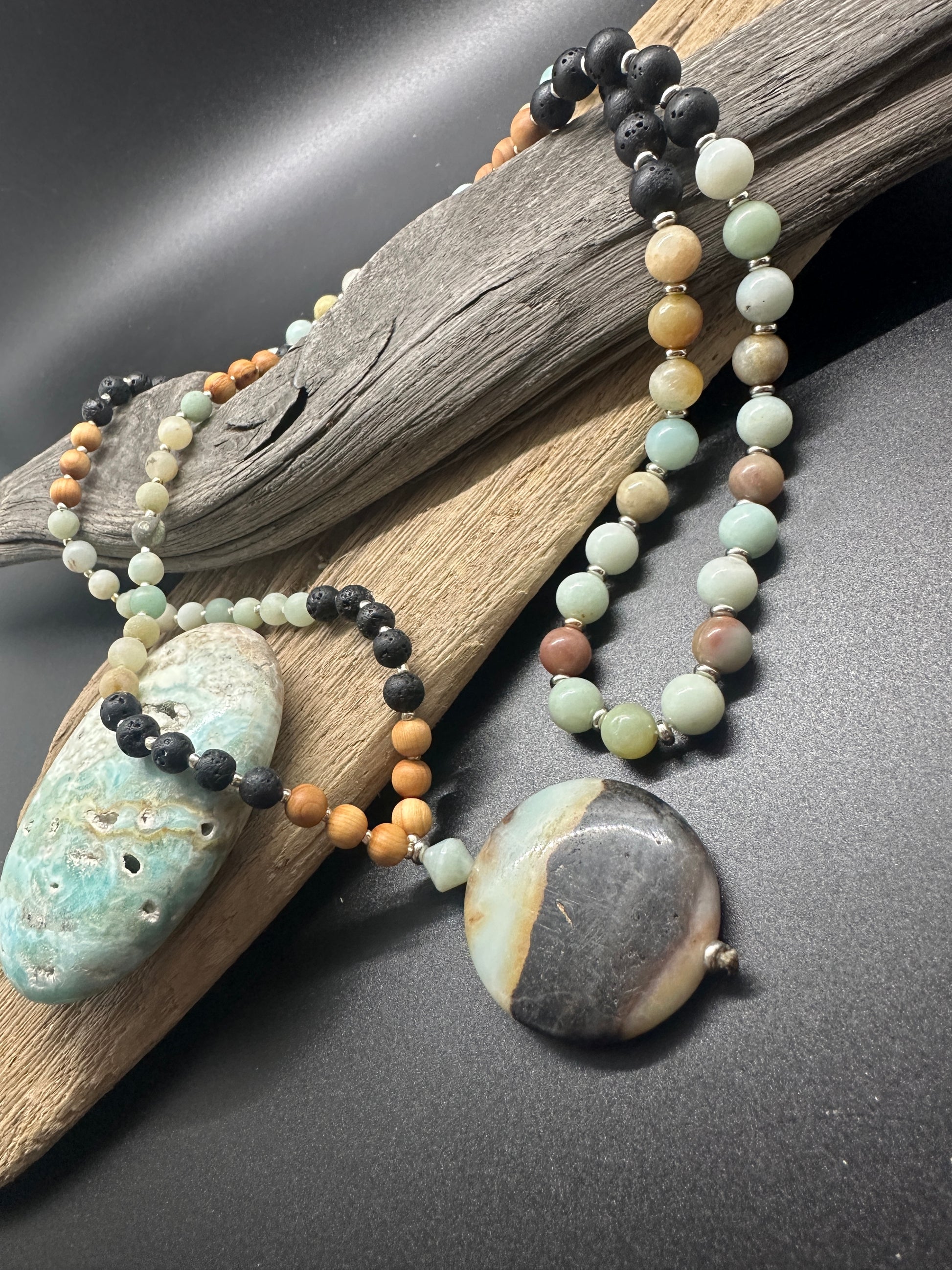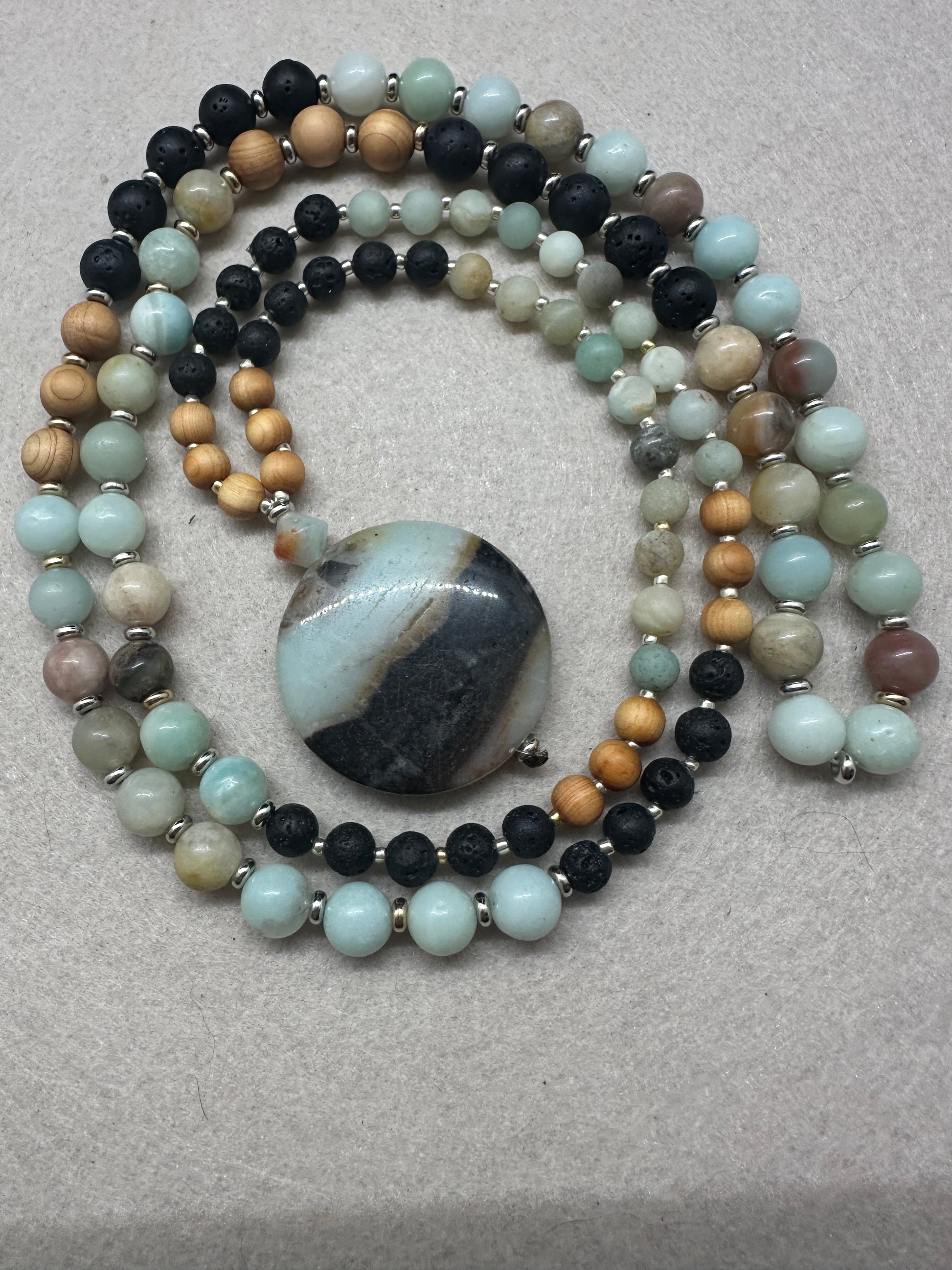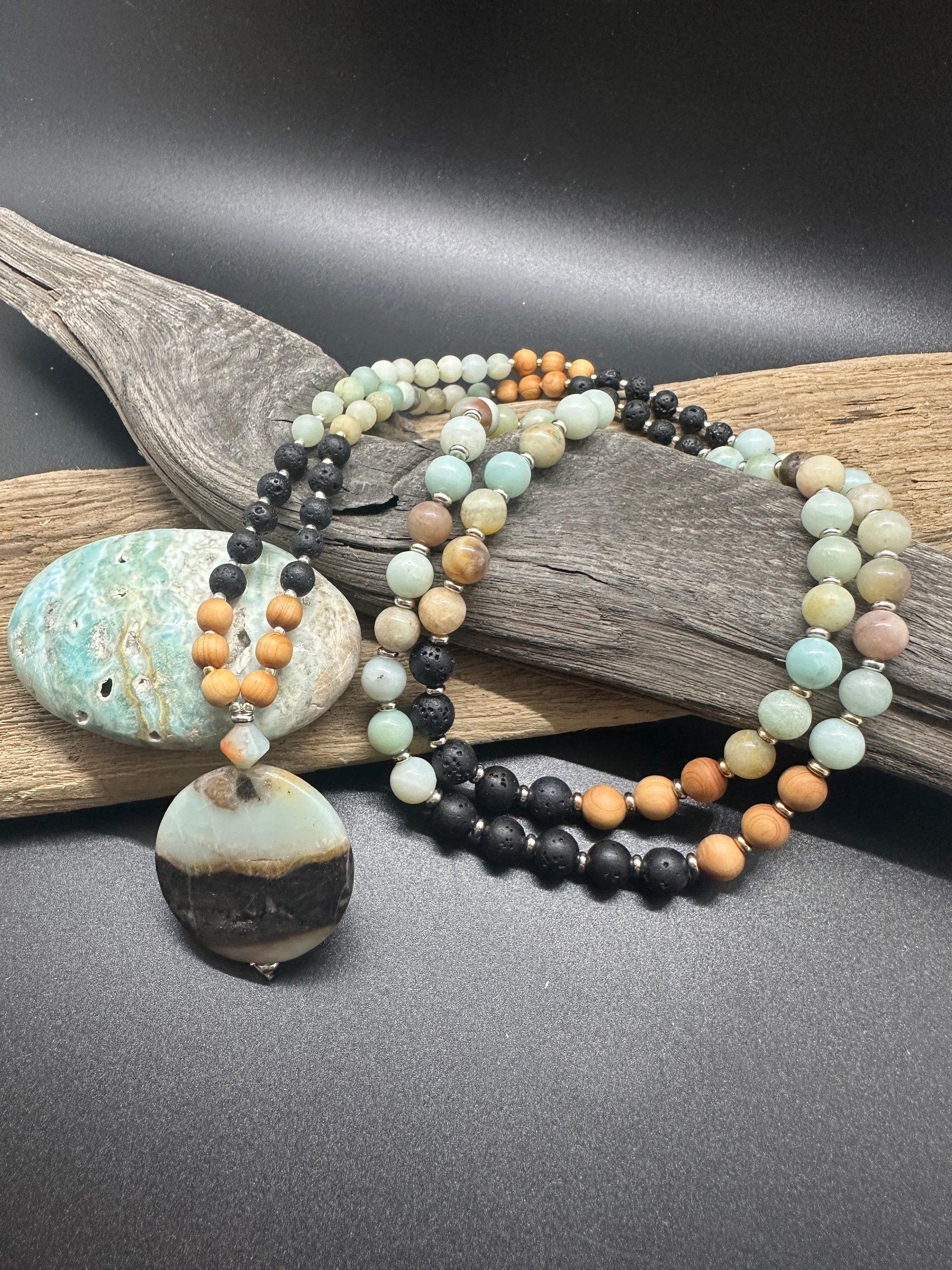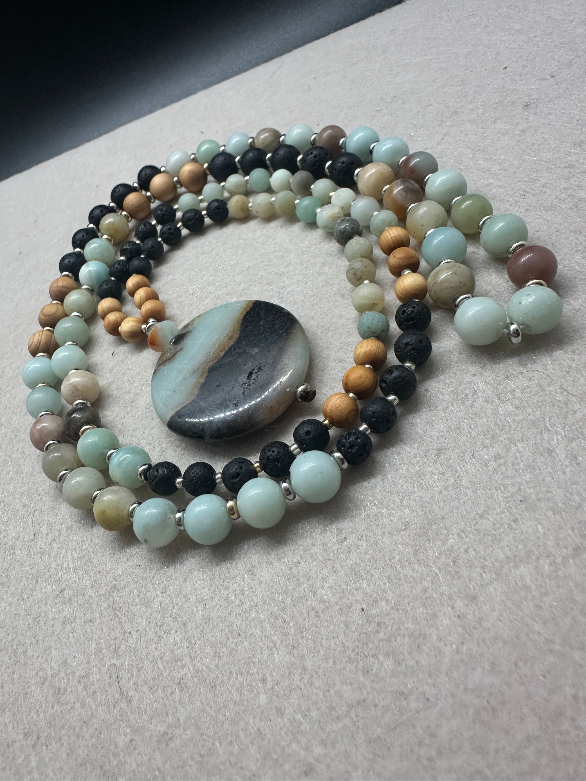 A calming meditation mala inspired by the meeting of ocean and earth. Amazonite flows with gentle courage and clear truth, while grounding lava and warm wood steady the spirit.