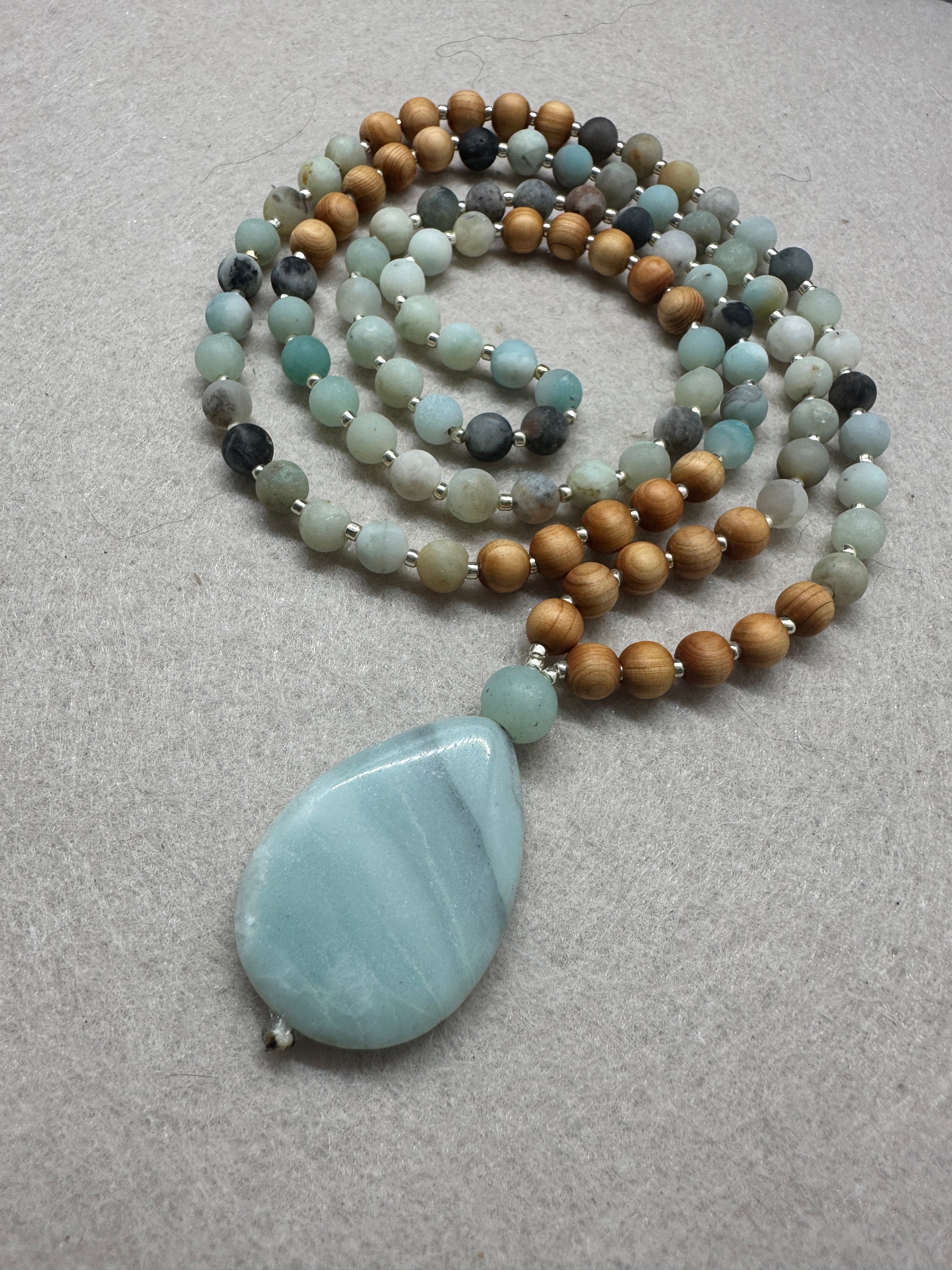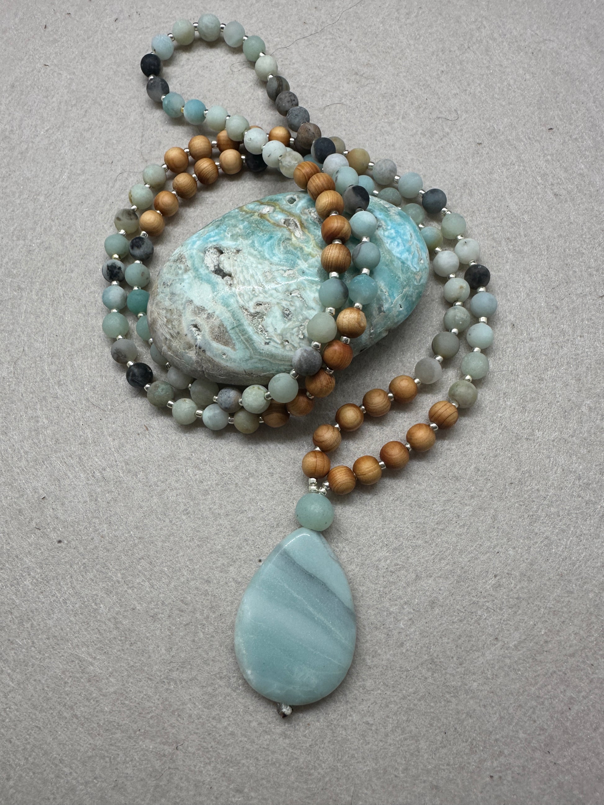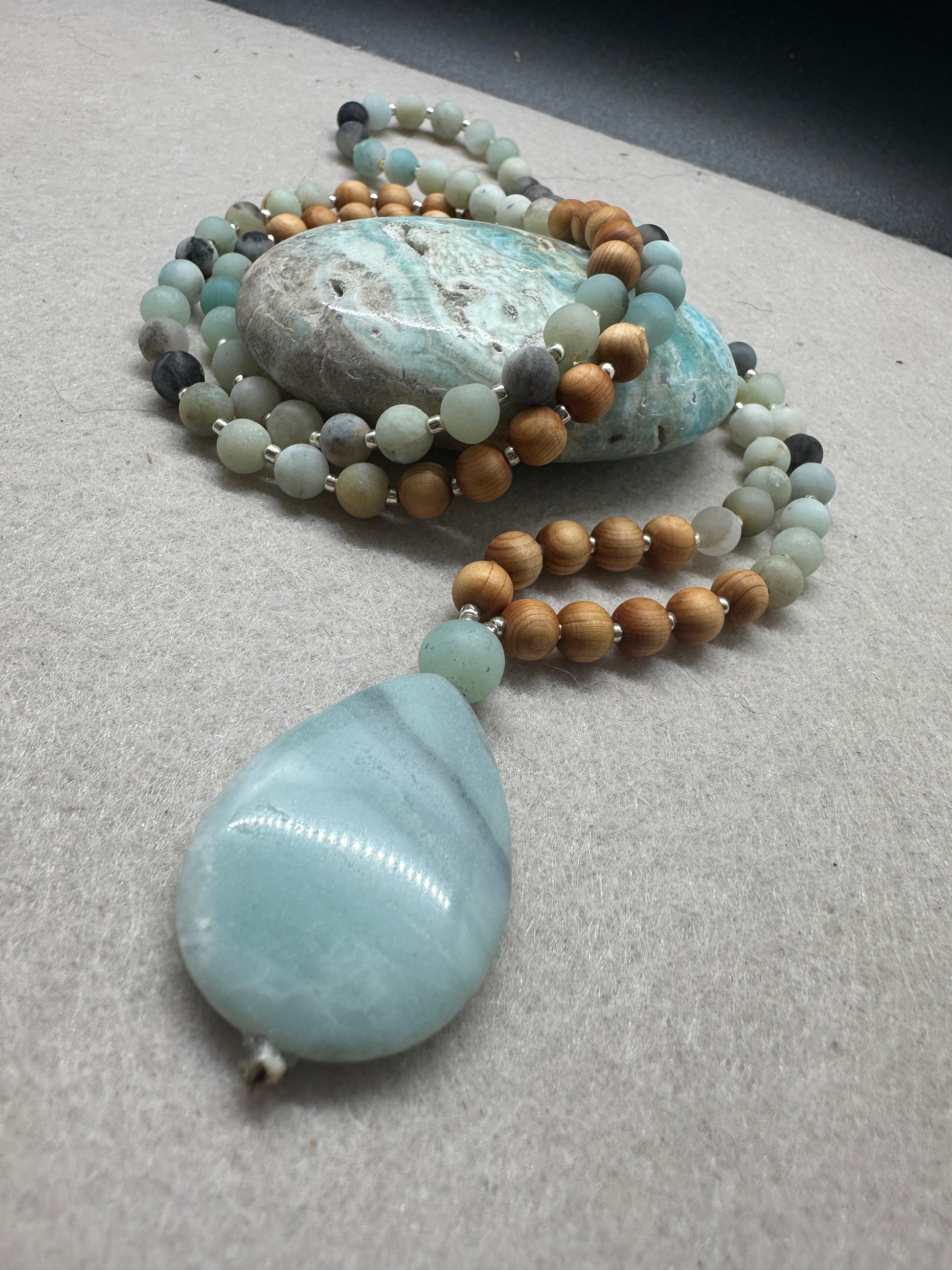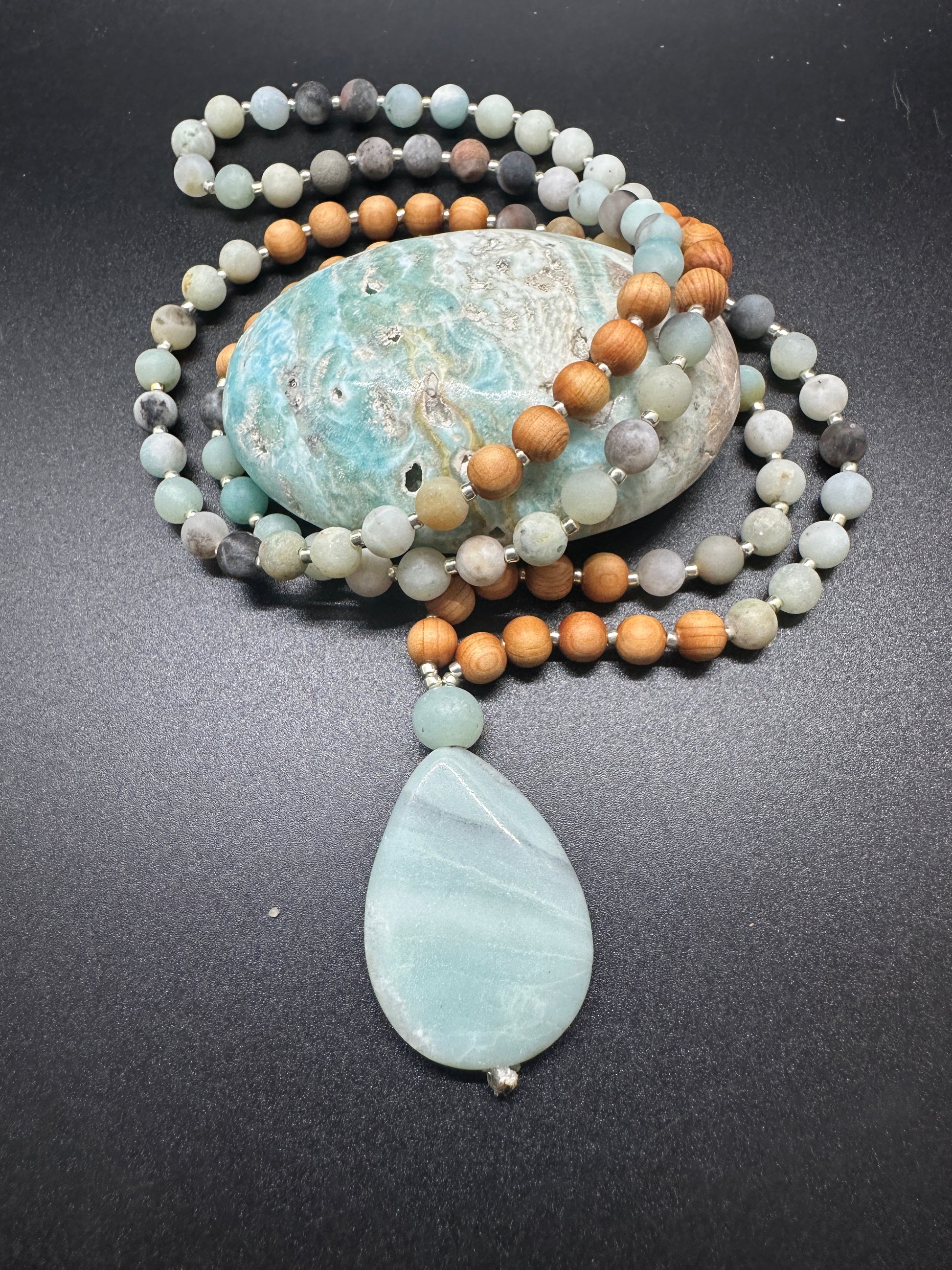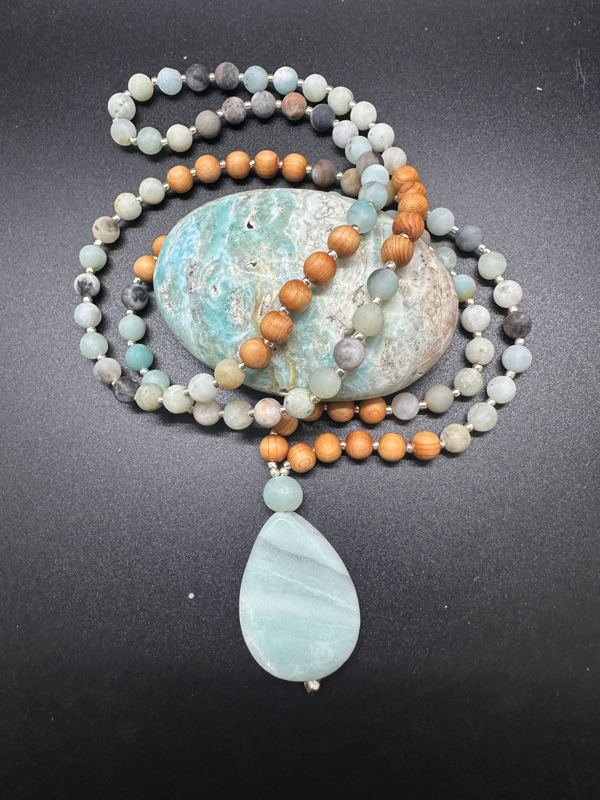 This mala pairs the tranquil blue-green of Amazonite with the grounding warmth of sandalwood, inviting both peace and presence. The large teardrop pendant rests at the heart, a touchstone for truth and emotional balance.