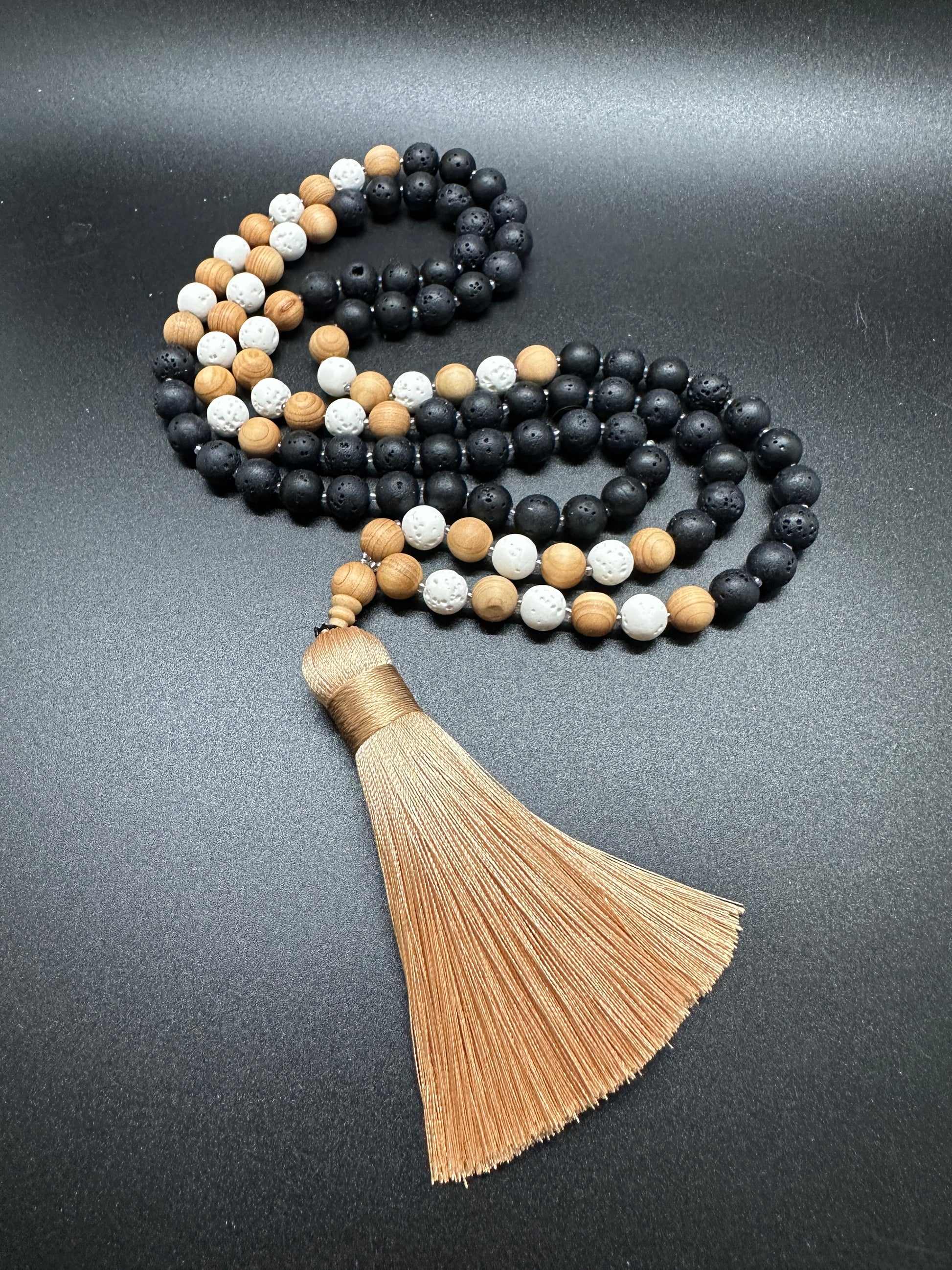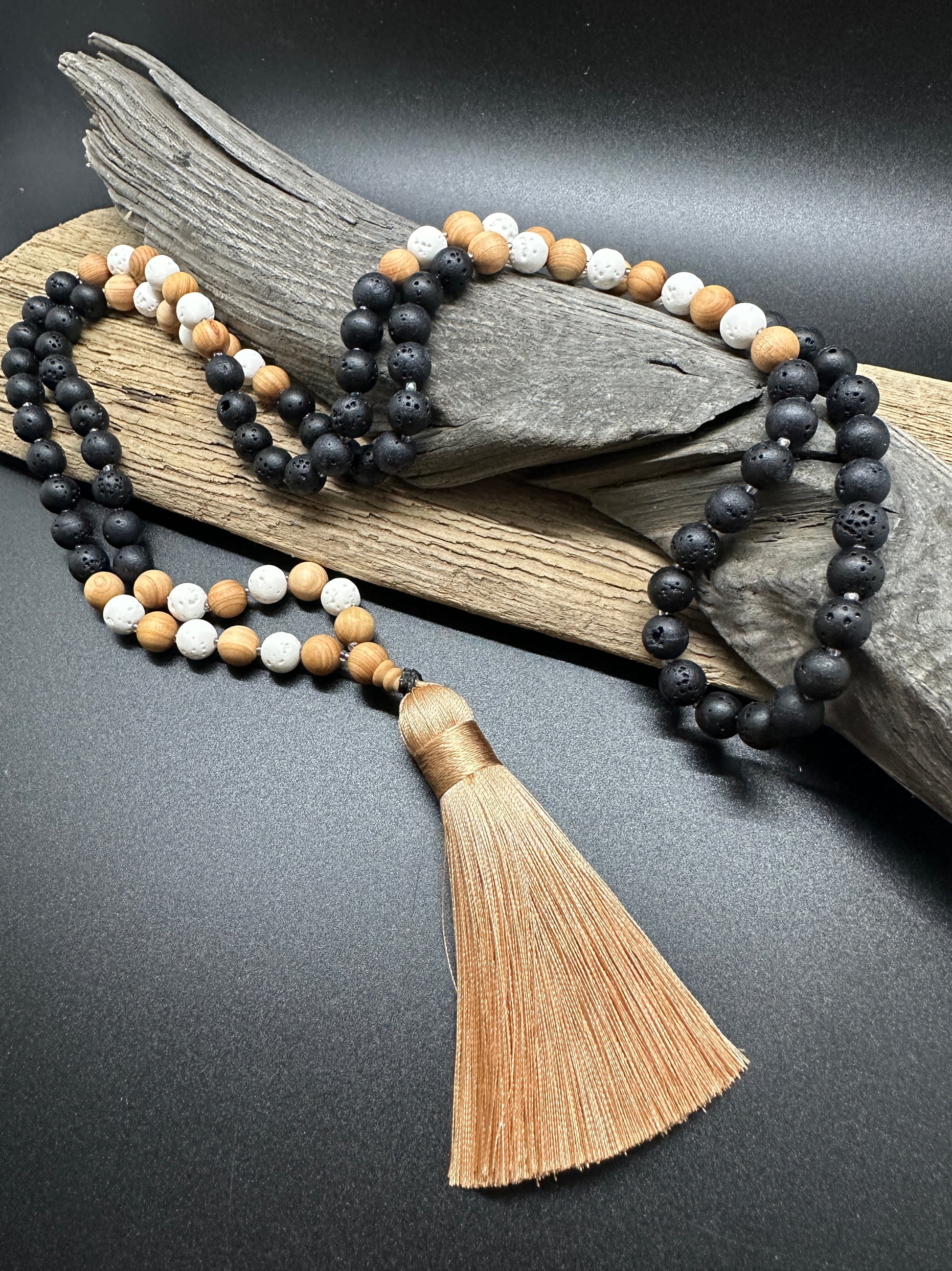 This mala was created with the intention of grounding and clearing energy while inviting a calm, open heart. The matte black lava offers steadiness and strength — the reminder to stay rooted. The white lava purifies and softens that energy, like breath meeting stillness. Sandalwood adds a gentle sacredness — warm, protective, and deeply soothing to the nervous system.